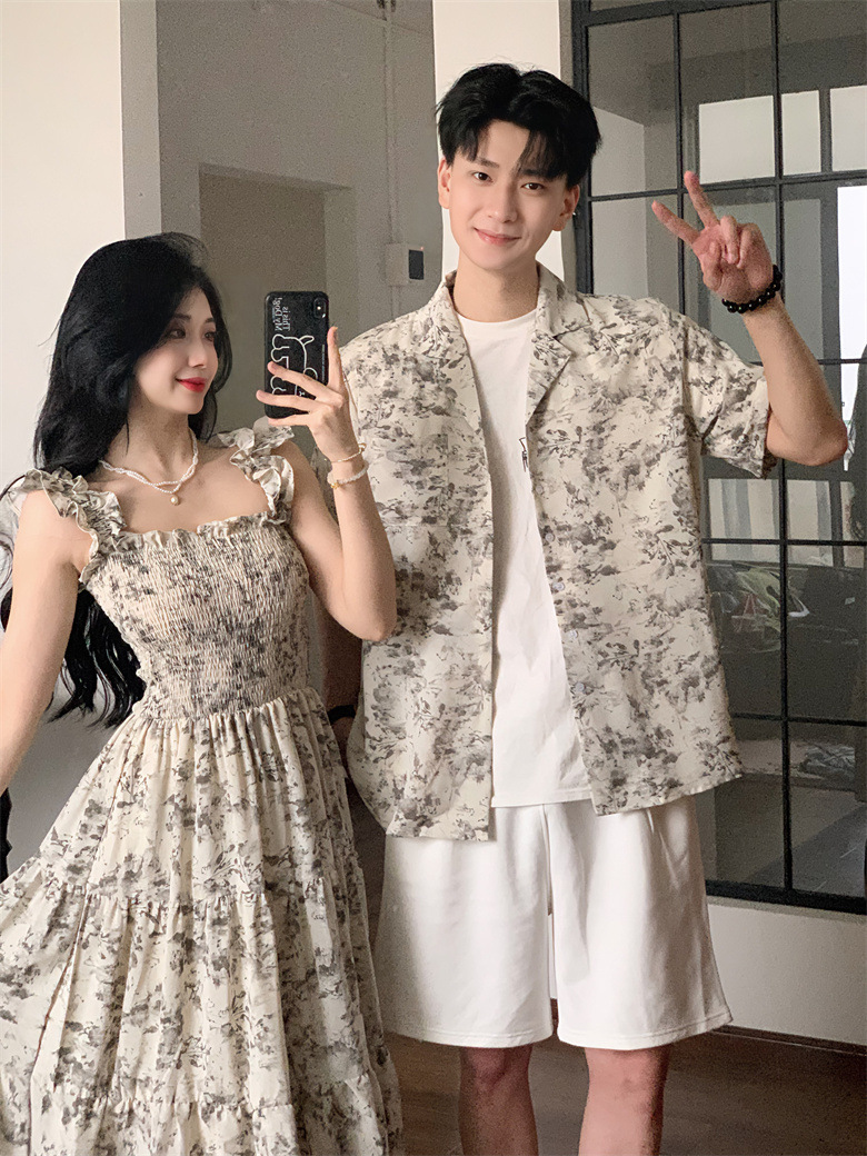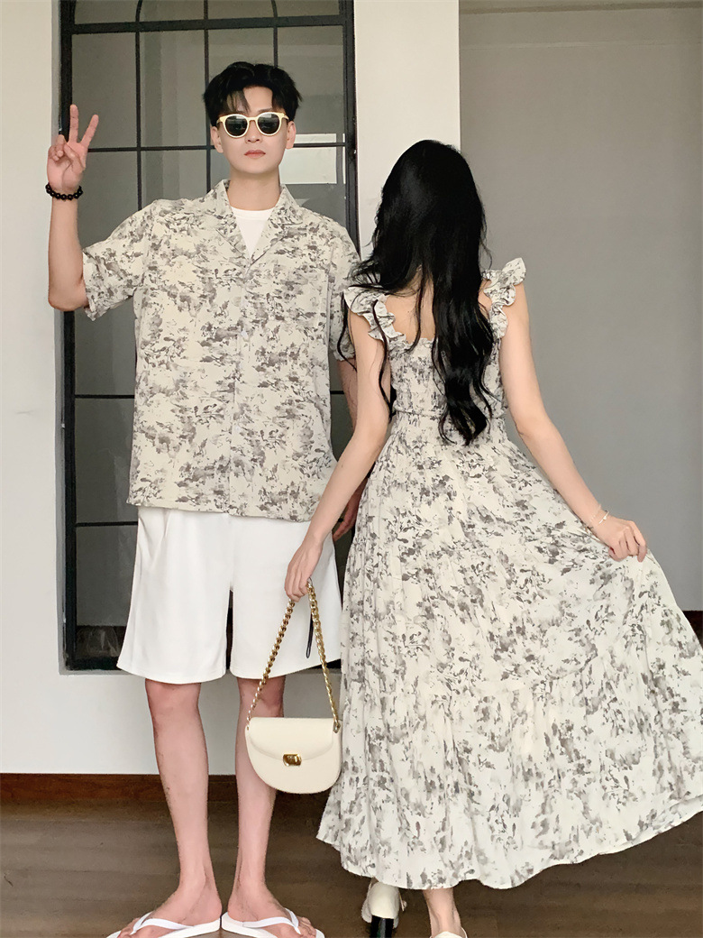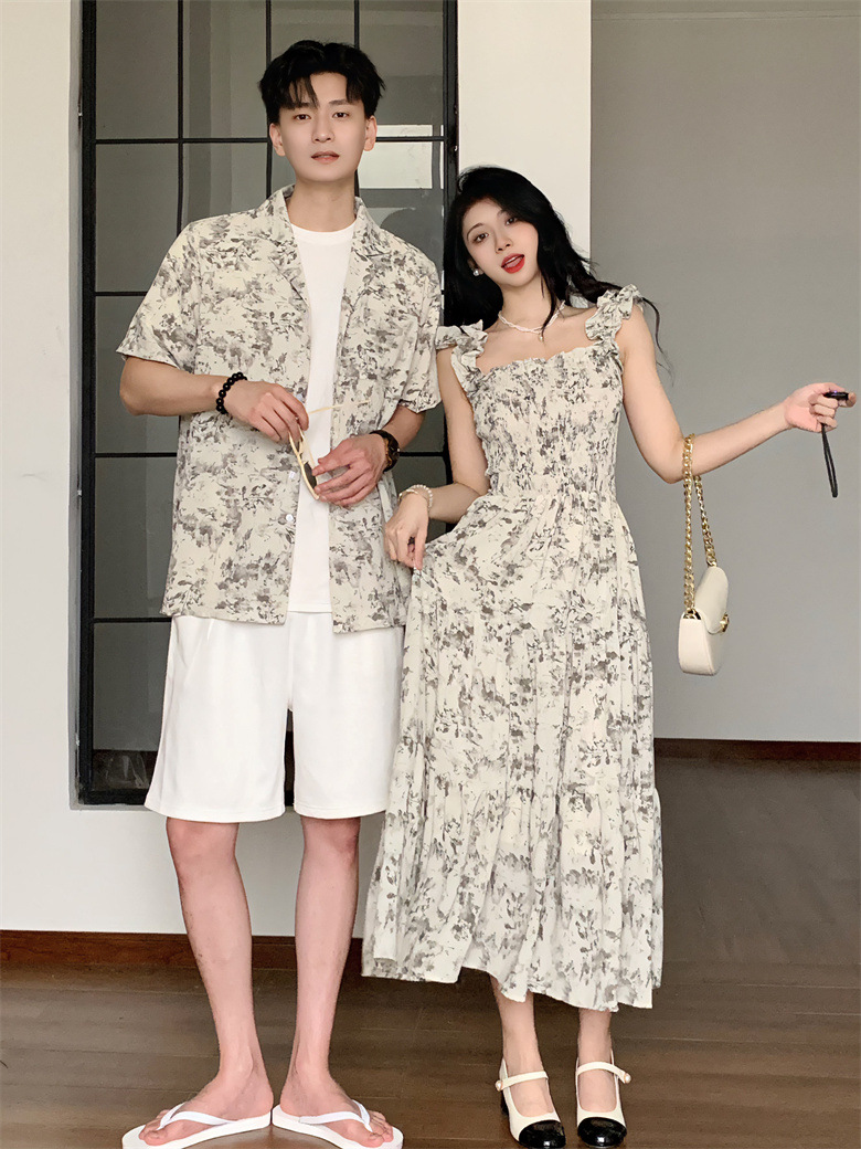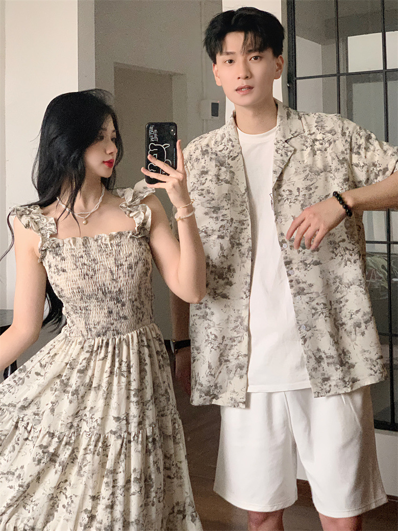 Couples Beach Dress Slim Fit Elegant Dress for Men Floral Shirt Short Sleeve